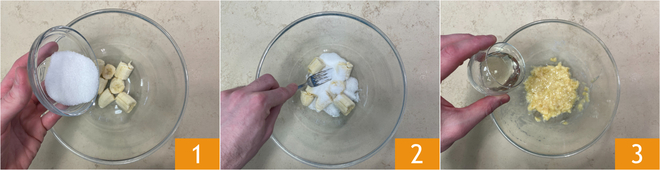 Para preparar las galletas con plátanos maduros, coloca el plátano en trozos en un bol, añade el azúcar 2 y aplasta la mezcla con un tenedor 2 hasta obtener un puré. A continuación añade el aceite de semillas 3.