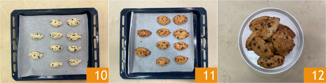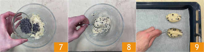 Para terminar añade las gotas de chocolate 7 y mezcla 8. Forma quenelles con la ayuda de dos cucharas y colócalas en una bandeja forrada con papel de horno 9.