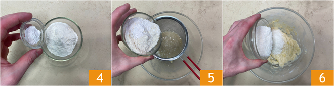 Mezcla la harina y la levadura 4, luego incorpora los polvos a la mezcla tamizándolos con un colador 5. Añade el coco rallado 6.
