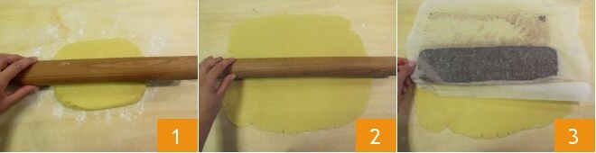 Cuando la masa haya reposado, toma el bloque y estíralo sobre una superficie ligeramente enharinada 1, hasta obtener un cuadrado de aproximadamente medio centímetro de grosor, un par de centímetros más largo que el relleno (aproximadamente 34 cm) 2. Luego coloca en el centro del rectángulo la mezcla de amarena 3, elimina el papel de horno