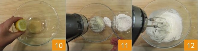 En esos 10 minutos prepara también el glaseado. Vierte la clara de huevo en un bol y añade el zumo de limón 1. Luego comienza a trabajar con las batidoras eléctricas, añadiendo el azúcar glas poco a poco 2 hasta obtener un glaseado denso 3.