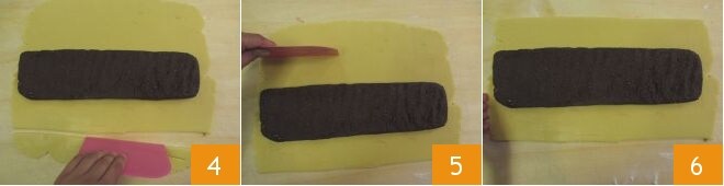 y utilizando una rasqueta, iguala los bordes de la masa, de modo que los dos bordes al juntarse cubran el relleno sin superponerse (4-5). El exceso de masa puedes congelarlo envuelto en film para hacer galletas. Una vez que hayas eliminado el exceso 6