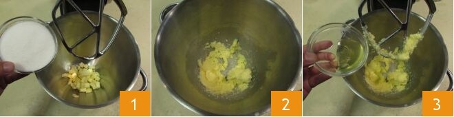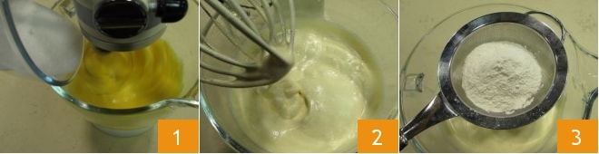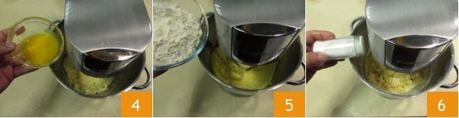 antes de añadir también las yemas 4. Trabaja unos minutos más hasta que se absorban por completo. Siempre con la batidora en acción a velocidad moderada, añade también la harina 5 y la sal 6.