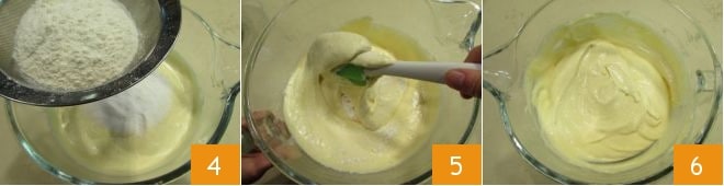 y la harina 4. Mezcla con una espátula de abajo hacia arriba 5 con movimientos muy delicados para no desinflar la mezcla. Cuando tengas una masa uniforme 6