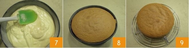 viértela dentro del molde 7 y hornea en un horno estático precalentado a 180° durante 25 minutos en la rejilla central. Haz siempre la prueba del palillo antes de sacar el pastel. Una vez cocido, saca el bizcocho del horno 8, y teniendo cuidado de no quemarte, desmóldalo inmediatamente y déjalo enfriar completamente sobre una rejilla 9.