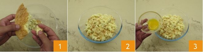 Cuando el bizcocho esté completamente frío y la masa casi haya terminado de endurecerse en el frigorífico, puedes empezar a preparar el relleno. Desmenuza el bizcocho en un bol (1-2), necesitarás 200 gramos. Luego agrega la yema 3,
