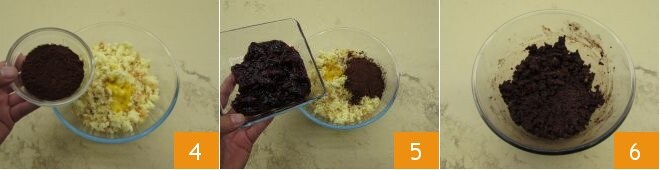 el cacao 4 y la mermelada de amarena 5. Amasa todo con las manos 6