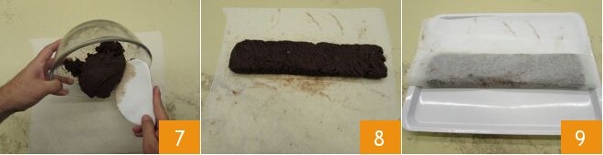 hasta obtener una mezcla homogénea y suave 7. Luego transfiere sobre una hoja de papel de horno que habrás colocado sobre la superficie de trabajo 8. Utilizando una rasqueta, dale a la mezcla una forma rectangular de 32x7 cm 9 y coloca en el frigorífico durante 30 minutos.