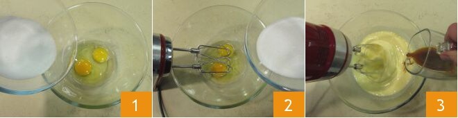 Para preparar las galletas de café, coloca en un bol grande los huevos enteros y el azúcar, y bate con las varillas eléctricas 2 hasta obtener una mezcla clara y homogénea. En este punto, vierte el café líquido preparado con la moka a temperatura ambiente 3 y continúa batiendo con las varillas eléctricas.