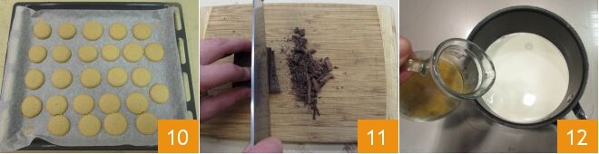 Hornea las galletas en un horno estático precalentado a 180° durante 10 minutos. Hornea una bandeja a la vez manteniendo la masa a temperatura ambiente. Una vez cocidas, retira las galletas del horno y déjalas enfriar 10. Mientras tanto, prepara la crema: pica el chocolate negro 11 y fúndelo al baño maría o en el microondas. En un cazo, calienta la nata y el café hecho con la moka 12.
