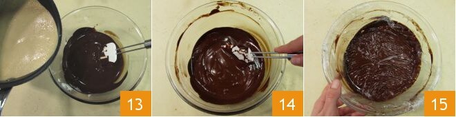 Cuando la mezcla haya alcanzado el punto de ebullición, retira del fuego y viértela sobre el chocolate fundido en tres veces, mezclando con una espátula 13. Debes obtener una crema con una consistencia bastante espesa 14. Cúbrela con film transparente y déjala solidificar en el frigorífico durante 30 minutos.