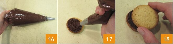 Pasado este tiempo, coloca la crema en una manga pastelera con boquilla de estrella de 6 mm de diámetro 16 y exprime un montoncito en el lado plano de las galletas 17. Cierra con otra galleta, dejando siempre el lado plano hacia la crema 18.