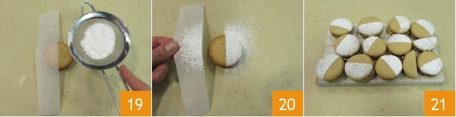 Para terminar, decora las galletas: coloca una tira de papel de horno sobre la mitad de la superficie y espolvorea la otra mitad descubierta con azúcar glas 19. Retira el papel con cuidado, obteniendo así un bonito efecto bicolor 20. ¡Las galletas de café están listas para ser disfrutadas 21!