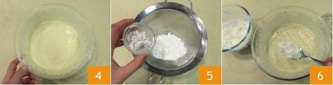 La mezcla debe quedar bien integrada 4. Tamiza la harina, la fécula y la levadura a través de un colador 5 e incorpóralos a la mezcla una cucharada a la vez 6. Mezcla con las varillas a baja velocidad.