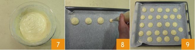 La mezcla quedará bastante cremosa 7. Ahora forra una bandeja con papel de horno, transfiere la masa a una manga pastelera con boquilla lisa de 10 mm de diámetro. Exprime discos de unos 3 cm de diámetro 8 manteniéndolos separados entre sí, ya que se expanden un poco durante la cocción. Con estas cantidades obtendrás unas 80 galletas 9.