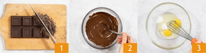 Para preparar las galletas de chocolate sin mantequilla, pica con un cuchillo el chocolate negro 1. Derrite el chocolate al baño maría, mezclando a menudo 2. Con la batidora de mano, trabaja los huevos con el azúcar 3.