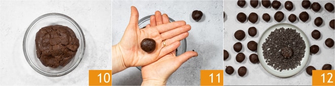 La masa resultará suave 10, pero déjala reposar en la nevera durante 1 hora, cubierta con film para endurecerla. Transcurrido el tiempo, la masa estará firme y manejable; toma trozos del tamaño de una nuez y dales forma girándolos entre las manos 11. Forma galletas que pesen entre 25 y 30 g. Coloca 80 g de chispas de chocolate en un plato, aplasta suavemente cada bolita sobre las chispas de chocolate para que se adhieran a la masa por un lado 12.