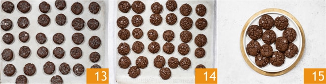 Cubre una bandeja con papel de horno y coloca las galletas 13. Hornea las galletas en el horno estático precalentado a 170° durante 15-20 minutos, saca del horno 14 y deja enfriar. Las galletas de chocolate sin mantequilla recién horneadas son suaves, pero al enfriarse se volverán quebradizas y crujientes 15.