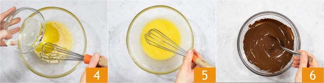 Incorpora el aceite 4 y mezcla 5. Añade el chocolate derretido y mezcla 6.