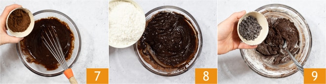 Incorpora también el cacao 7, mezcla y añade el extracto de vainilla, la harina y la levadura 8. Termina con 30 g de chispas de chocolate 9 y amasa rápidamente primero con una cuchara y luego con las manos.