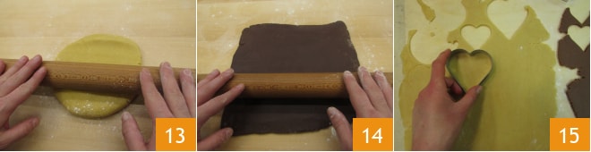 Pasado el tiempo necesario, toma la masa blanca y extiéndela con un rodillo hasta un espesor de 1-2 cm 13. Toma también la masa de cacao y extiéndela al mismo espesor 14. Utilizando un cortador de galletas con forma de corazón de 7.5 cm de ancho y 7 cm de largo, corta la primera galleta.