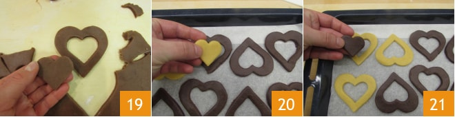 Utilizando un cortador de galletas con forma de corazón más pequeño, de 4.5 cm de ancho y 4 cm de largo, corta la galleta 16 para obtener un corazón más grande "vacío" y uno más pequeño "lleno". Separa las dos partes 17 manteniéndolas ambas, porque las necesitarás en breve. Pasa a la masa de cacao y realiza la misma operación: recorta una galleta de corazón y luego córtala con el molde más pequeño 18.