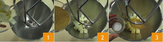 Para preparar las galletas de corazón bicolor, lo primero que hay que hacer es verter la mantequilla fría en el bol de una batidora planetaria equipada con pala 1. Añade el azúcar moreno 2 y la sal 3. Trabaja a velocidad moderada hasta obtener una mezcla homogénea y cremosa.