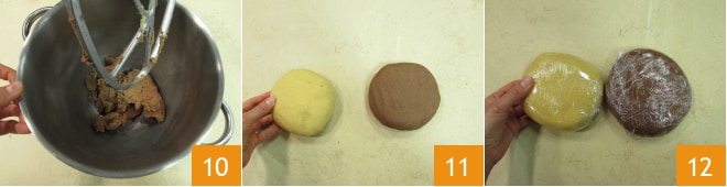 y trabaja con la pala hasta que se absorba 10. En este punto, habrás obtenido dos masas, una blanca y una negra 11. Envuelve cada una por separado en film transparente 12 y déjalas reposar en el frigorífico durante una hora.