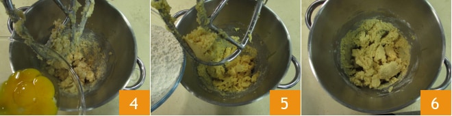 Incorpora las yemas 4 y trabaja hasta que estén bien absorbidas. Luego agrega también la harina 5 y continúa trabajando hasta que esté completamente incorporada 6.