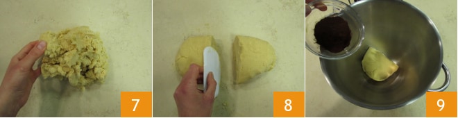 Transfiere a una superficie 7 y trabaja unos segundos para compactar. Divide la masa por la mitad 8 y transfiere una de las partes nuevamente a la batidora. Agrega el cacao 9