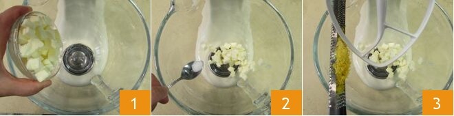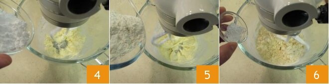 después, siempre con la batidora en funcionamiento, añade el azúcar glas 4. Espera aproximadamente 1 minuto, hasta que esté completamente absorbido y añade también la harina tamizada 5. Añade la levadura en polvo 6