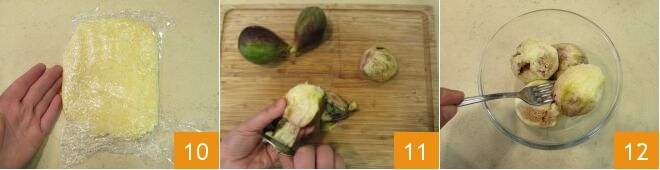 Dadle forma de un bloque y envuelvelo completamente, de modo que no queden partes descubiertas, luego colocad en el frigorífico para que se endurezca durante al menos 2 horas 10. Mientras tanto, ocupáos del relleno de higos. Lo primero es pelarlos 11, transferirlos a un bol y aplastarlos con un tenedor 12. Debéis obtener 260 gramos.