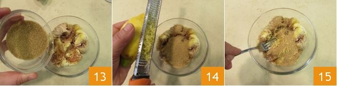 Añade el azúcar moreno 13, la cáscara de medio limón 14 y trabaja la mezcla con el tenedor para amalgamar todos los ingredientes 15.