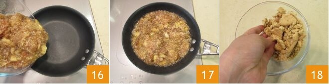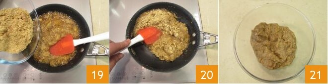 Vierte la mezcla obtenida en una sartén 16 y déjala cocer durante unos diez minutos 17. Mientras tanto, tritura las galletas a mano 18.