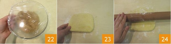 y luego en el frigorífico, cubriendo con película solo en esta última fase 22. Después de que la masa quebrada haya reposado, trasládala a una mesa de trabajo ligeramente enharinada 23 y extiéndela hasta obtener un grosor de aproximadamente 4 mm 24.