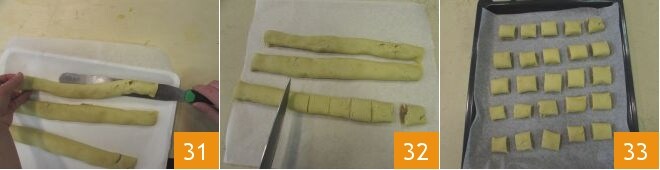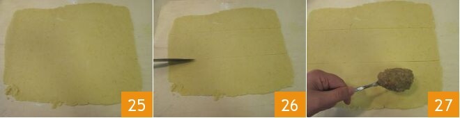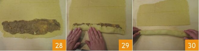 esparciéndola bien, dejando algunos cm del borde 28. Luego dobla la tira hacia el centro desde ambos lados 29 de modo que se forme una barra rellena 30. Repite la misma operación también para las otras dos tiras de masa.