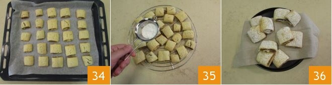 y cocínalos en horno estático precalentado a 180° en el estante central durante 20 minutos. Cuando estén dorados, saca las galletas del horno 34, espera unos minutos antes de transferirlas a una rejilla. Déjalas enfriar completamente y espolvorea con azúcar glas 35, antes de servirlas 36.