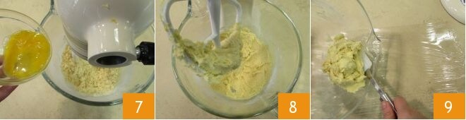 y por último el huevo batido 7. Trabajad todo, hasta obtener una masa homogénea 8. Luego transferid la mezcla, ayudándoos con una espátula, sobre una hoja de película que habréis colocado en la mesa de trabajo 9.
