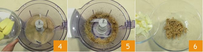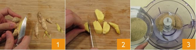 Para realizar las galletas de jengibre, empezad pelando el jengibre con un cuchillo 1, luego cortadlo en trocitos 2. En el bol de un procesador de alimentos, verted la harina de avellanas, el azúcar moreno 3
