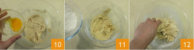 Verted en la masa integrada la yema de huevo 10, mezclad de nuevo, luego unid en dos tiempos la harina, de esta forma será más práctico integrarla con el resto de la masa 11, comenzad a amasar a mano 12
