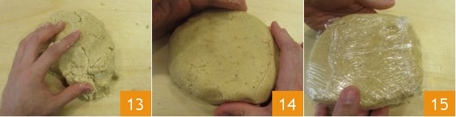 Recoged bien todos los ingredientes, luego transferid la masa a una superficie de trabajo ligeramente enharinada 13 y compactad la masa creando un bloque 14, envolvedlo con film de cocina 15 y colocadlo en el frigorífico para que se endurezca al menos 1 hora.