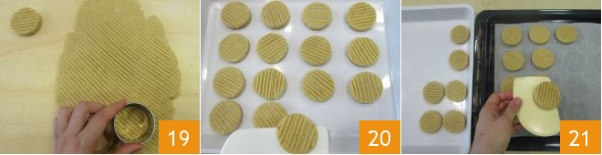 luego con un cortador de galletas de 6 cm de diámetro, recortad las galletas 19. Amasad nuevamente la masa sobrante para realizar más galletas: con estas cantidades obtendréis 18. A medida que realicéis las galletas, colocadlas en una bandeja ayudándoos con una espátula para no calentar demasiado la masa 20, luego dejadlas endurecer en el frigorífico durante 10-15 minutos, de esta forma mantendrán la forma durante la cocción. Transcurridos los 10-15 minutos, sacad del frigorífico la bandeja y transferid las galletas a una bandeja de horno recubierta con papel de horno 21.