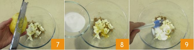 Aromatizad con la ralladura de limón 7, añadid también el azúcar 8 y mezclad todo con una espátula 9 para integrar los ingredientes.