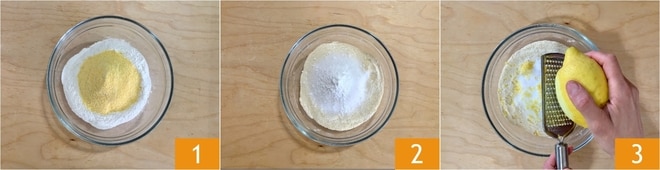 Para hacer las galletas de limón sin mantequilla, vierta en un bol la harina 00, agregue la harina instantánea para polenta (harina de maíz) 1 y mezcle. Añada también el azúcar 2, la levadura en polvo para dulces, la cáscara rallada de medio limón 3 y una pizca de sal.