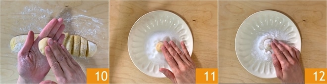 enróllelas en la palma de la mano para formar bolitas 10 y páselas primero por el azúcar granulada 11 y luego por el azúcar glas 12.
