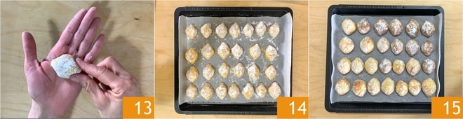 Aplaste con los dedos la bolita en el centro y luego estire los dos extremos, casi dándole forma de limón 13. Coloque las galletas en una bandeja forrada con papel de horno 14 y hornee en horno estático precalentado a 180 ° durante unos 12 minutos. Al final de la cocción estarán doradas por la parte superior y bien cocidas en la parte inferior, sáquelas del horno y déjelas enfriar 15.