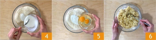 Mezcle para homogeneizar todos los ingredientes. En este punto, agregue el yogur de limón 4 y dos huevos 5, mezcle con una cuchara para incorporarlos 6.