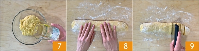 Finalmente, vierta el aceite de semillas de maíz 7 y amase directamente en el bol. Debe resultar una masa suave y ligeramente pegajosa, transfiérala a una superficie ligeramente enharinada y forme un cilindro 8. Saque 26 piezas de unos 25 g cada una 9,