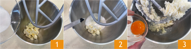 Para preparar las galletas de mantequilla, primero pon la mantequilla fría en el bol de la batidora, equipada con el gancho de hoja. Añade el azúcar 1, una pizca de sal, las semillas de la vaina de vainilla 2 y enciende la máquina durante unos segundos. Cuando la mantequilla se haya ablandado, añade la yema de huevo 3 y mezcla durante aproximadamente un minuto.