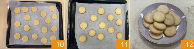Después de haber formado las galletas, colócalas en una bandeja forrada con papel de horno, dejándolas ligeramente separadas unas de otras 10. Hornea en horno estático a 170°C durante unos 15 minutos 11, luego retira y deja enfriar. ¡Tus galletas de mantequilla están listas para ser disfrutadas 12!